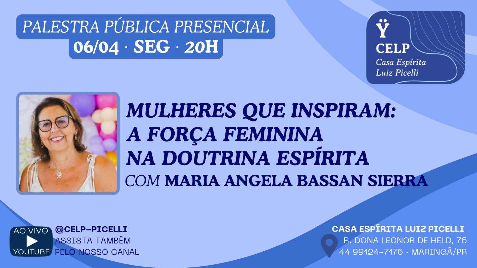 Convidamos a todos para a Palestra Pública Presencial – “Mulheres que inspiram: A força feminina na doutrina espirita”, na CELP com Maria Angela Bassan Sierra.